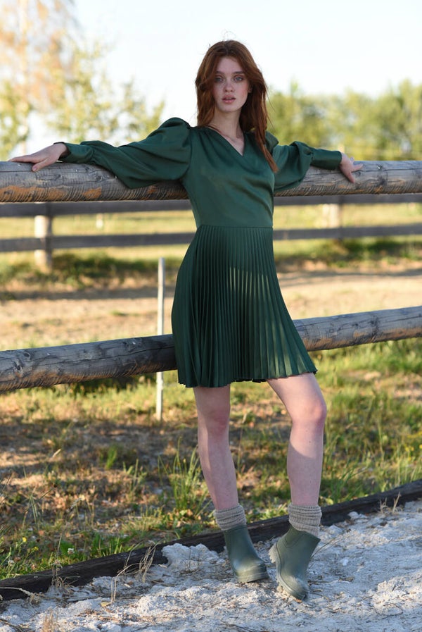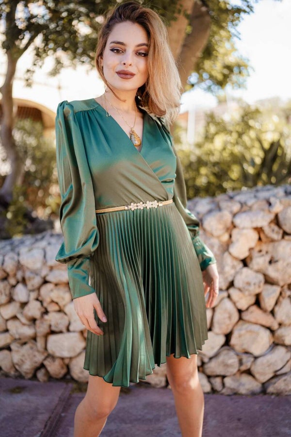 Olive wrap pleated designer dress
