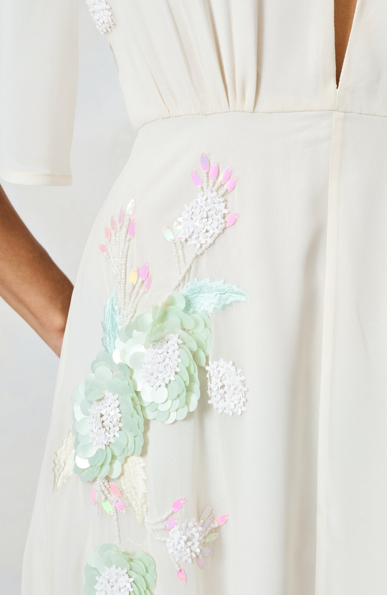 Designed for those first special moments of spring, The Aphrodite brings an ethereal elegance to the season. A plunge neckline and flutter sleeves create a soft, feminine silhouette, while embellishment adds subtle sparkle. In ivory, it feels dreamy, refined and perfect for early season occasions where you want to feel unforgettable.